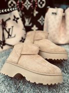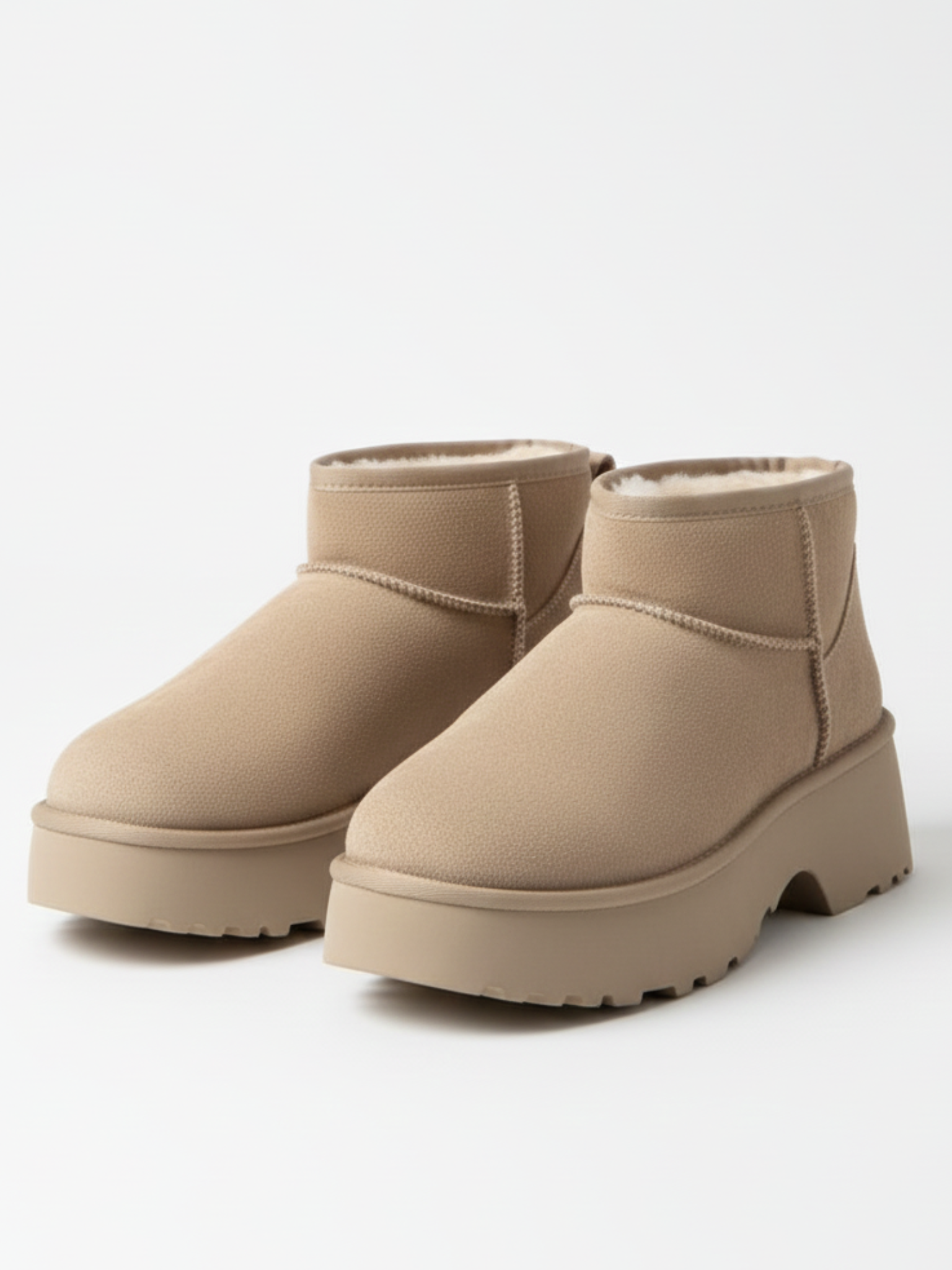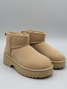Diese Plateau-Boots vereinen modernen Streetstyle mit maximalem Tragekomfort – das weiche Obermaterial in warmem Beigeton trifft auf eine markante, erhöhte Sohle für den perfekten Mix aus Trend und Gemütlichkeit.