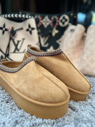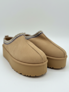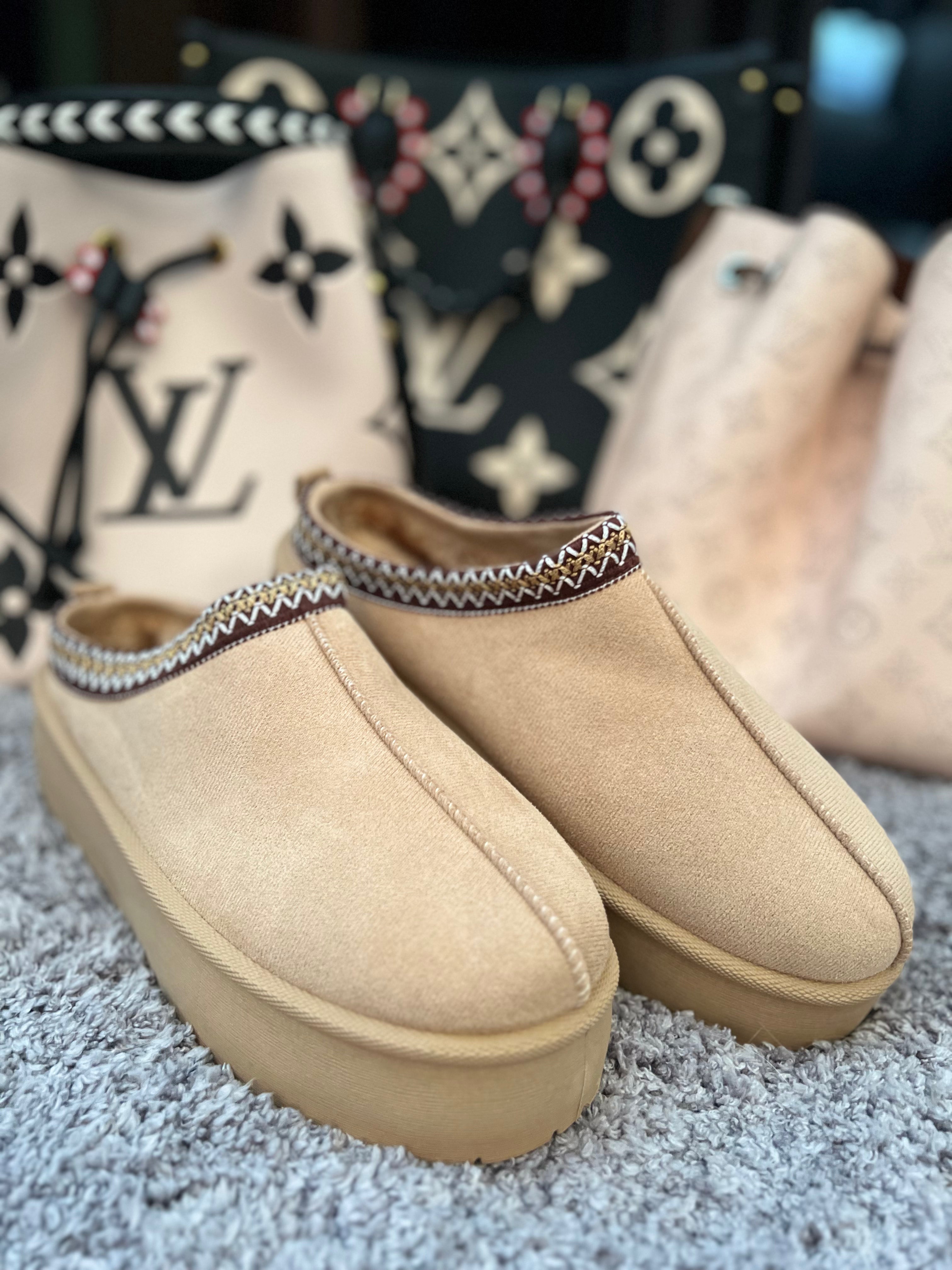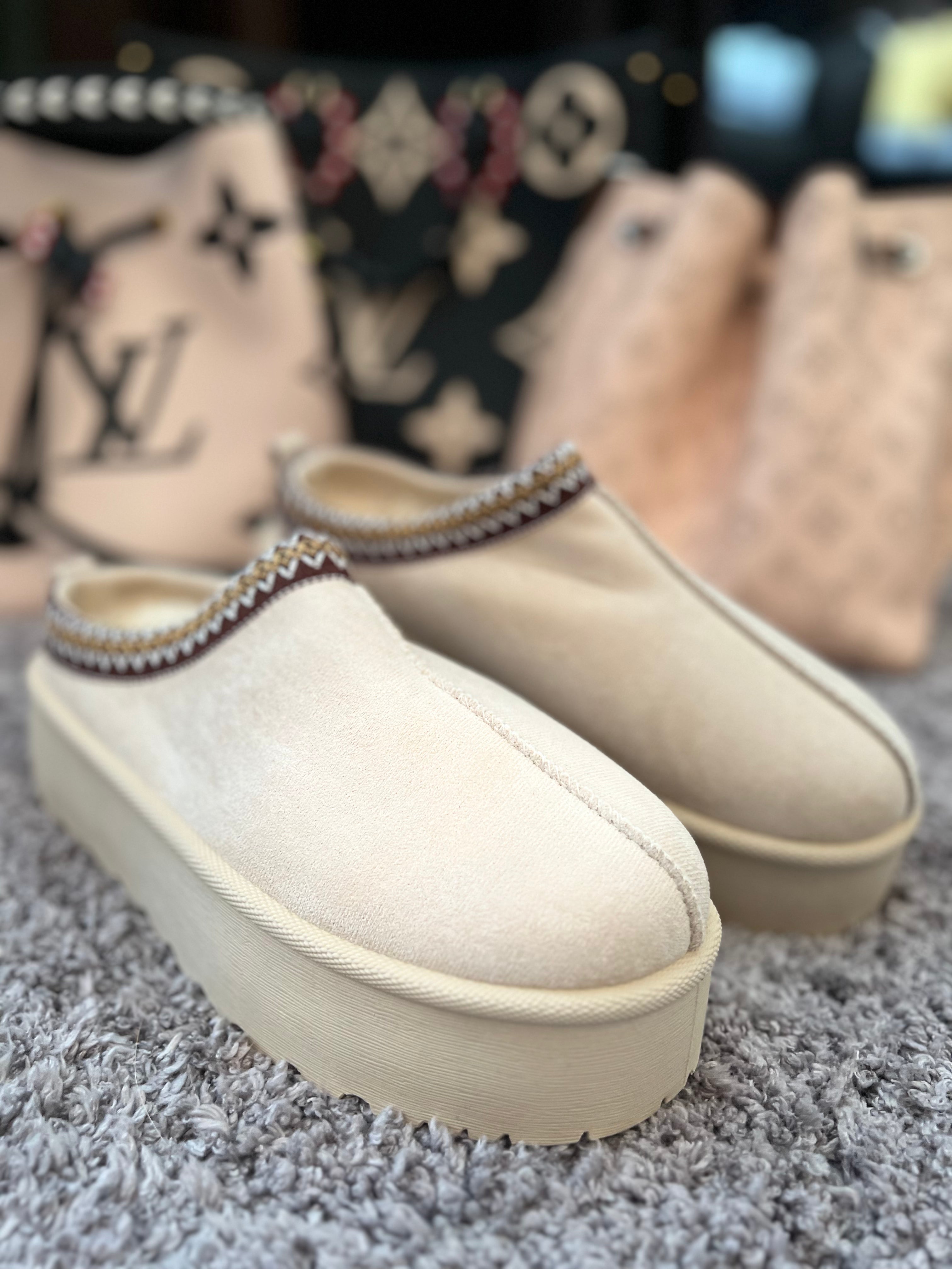 COZY ELEGANCE MEETS STYLE. Diese Plateau-Slipper vereinen Komfort und Trendbewusstsein in einem Design – das weiche, beigefarbene Obermaterial sorgt für ein angenehm warmes Tragegefühl, während die erhöhte Sohle deinem Look einen modernen, stylischen Touch verleiht.