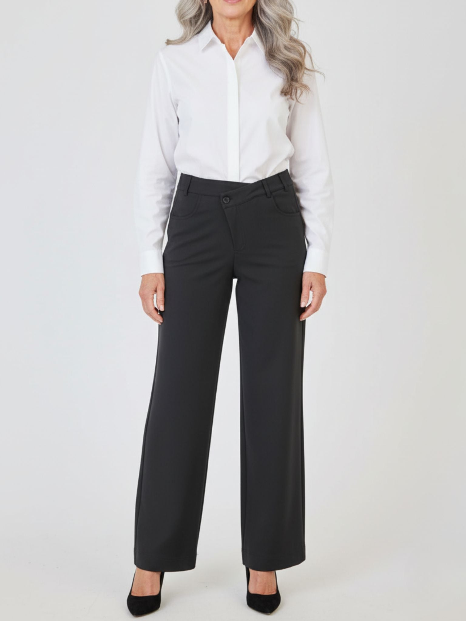 Ein cooler Twist für deinen Look – diese Hose mit schrägem Bund-Detail und modernem Wide-Leg-Schnitt sorgt für einen stilvollen, spannenden Auftritt. Der vorne leicht abgesenkte Bund mit schräg gesetztem Reißverschluss und zweifachem Knopfverschluss verleiht dem Design eine besondere Raffinesse.