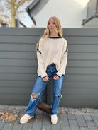 Das besondere Highlight: die kontrastfarbigen Strickdetails an Kragen, Ärmeln und Schultern. Sie verleihen dem Pullover einen einzigartigen, handgemachten Look, der sowohl in Creme als auch in Tiefgrün mit Weiß-Akzent edel und modern wirkt.